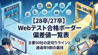 Webテスト対策人気企業50社のWebテスト合格ボーダー|SPI・玉手箱・TG-WEBなど 「ESは自信があるのに Webテスト で落ちる…」そんな28卒/27卒必見。商社・コンサル・メーカーなど主要50社の合格ボーダーとテスト形式を完全網羅。SPIや玉手箱の足切りラインを把握。 2026.01.18Webテスト対策